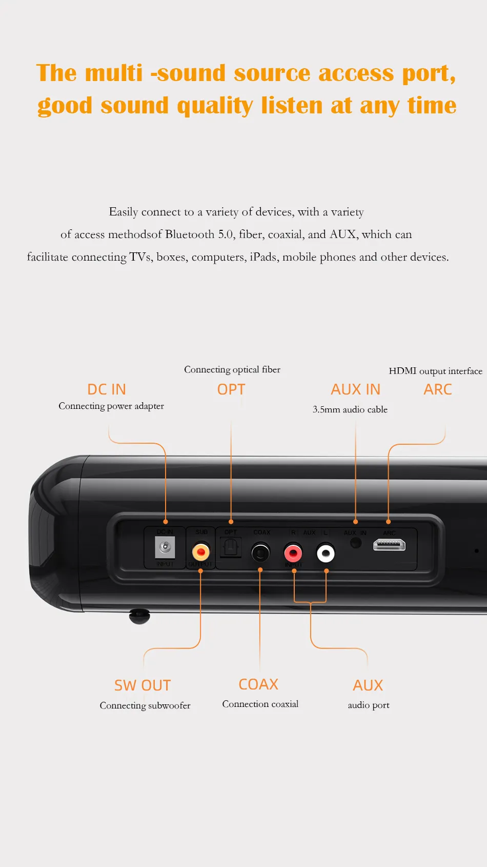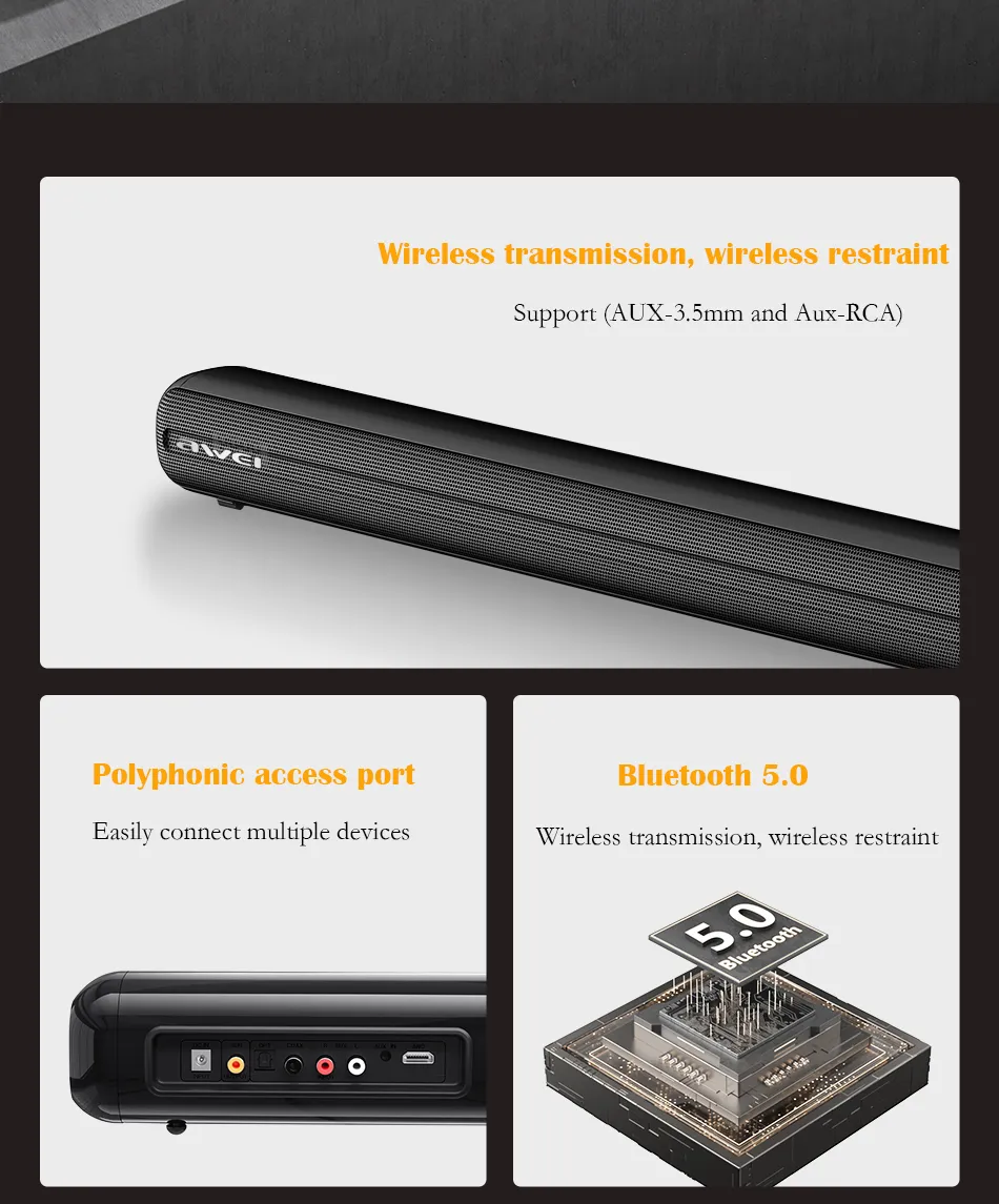Transform your home entertainment experience with the Awei Y520 Soundbar, a sophisticated audio solution that combines powerful performance with advanced technology. This premium soundbar system delivers immersive sound quality while offering seamless integration with modern entertainment setups.