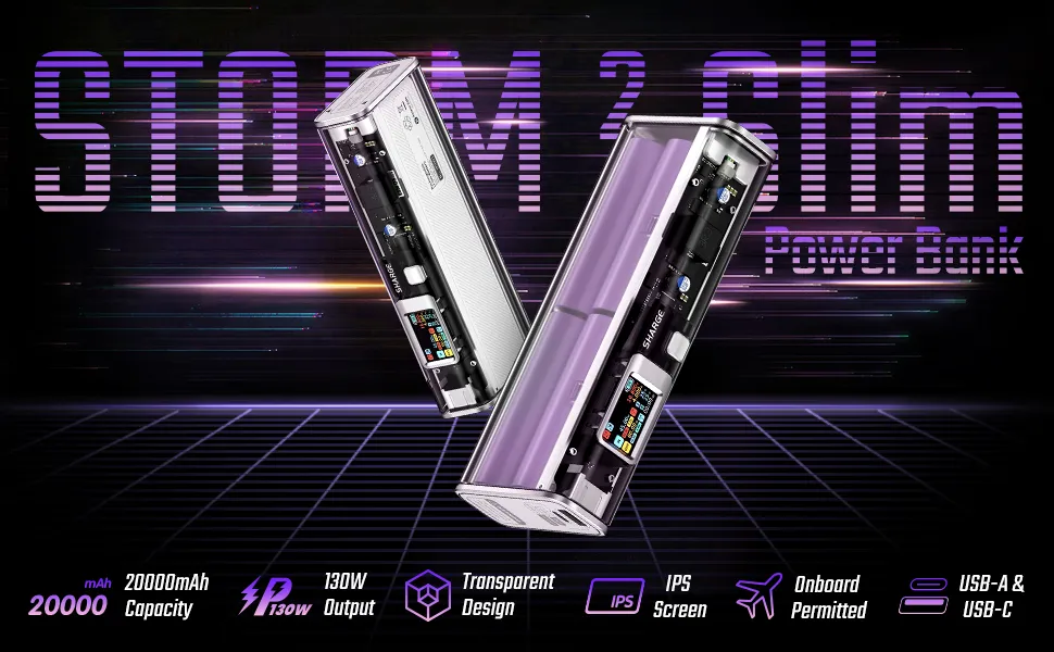 The Shargeek STORM2 Slim 100W Power Bank features a transparent design, 20,000mAh capacity, 130W fast charging, and universal device compatibility.
