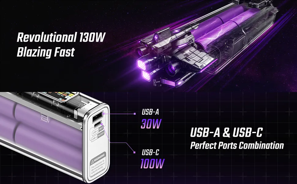 Equipped with a PD 100W USB-C port, this power bank can charge a MacBook Pro 16” from 0% to 50% in just 41 minutes. Combined with a 30W USB port, it supports dual-device charging with a maximum output of 130W, meeting all your charging needs.