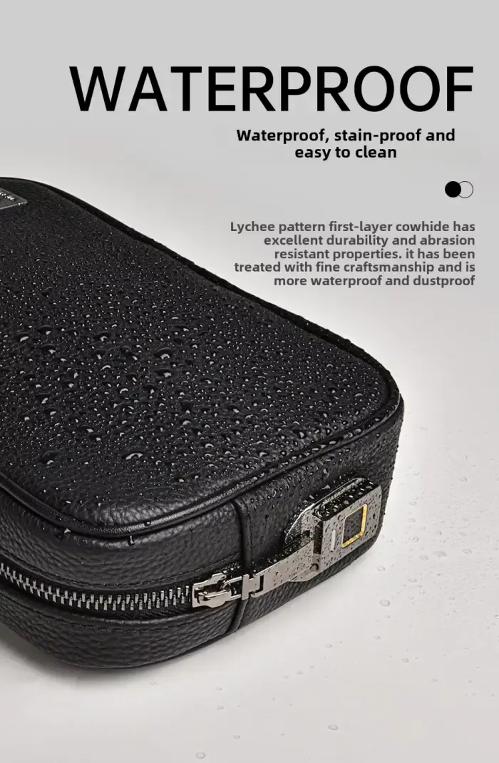 It combines luxury, security, and practicality in one accessory. The genuine leather elevates style, while the fingerprint lock ensures maximum protection. Its versatile design suits professionals, travelers, and anyone seeking a secure yet elegant pouch.